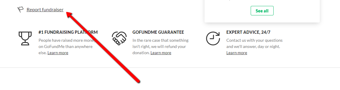 If you ever see a problem with a GoFundMe fundraiser you want to report, customer services advises that you visit the fundraiser page and scroll to the bottom where you’ll see a flag with a link that says “report fundraiser.”
