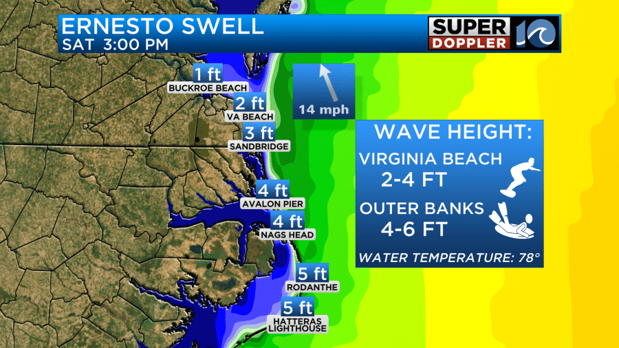 The waves will run about 2-4 ft in Virginia Beach today. They will be about 5-7 ft along the Outer Banks.