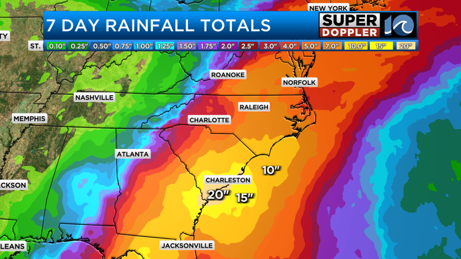 Right now, the bottom line for our region is we just need to keep an eye on it. It doesn’t look like a direct hit, but we could see impacts from rain, and depending on the track – a risk for some spin up tornadoes. These typically happen to the north and east of the center of the storm, so a track west of us would bring that risk. Heavy rain is going to happen with this storm, but the overall amounts and where could change. Here’s the latest 7 day rainfall outlook based on the current NHC track. Yes, that is 15-20″ for parts of SC!