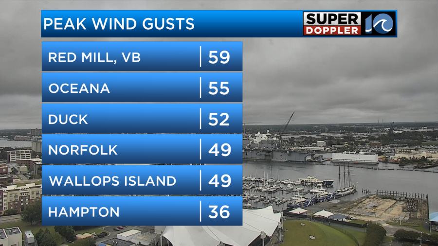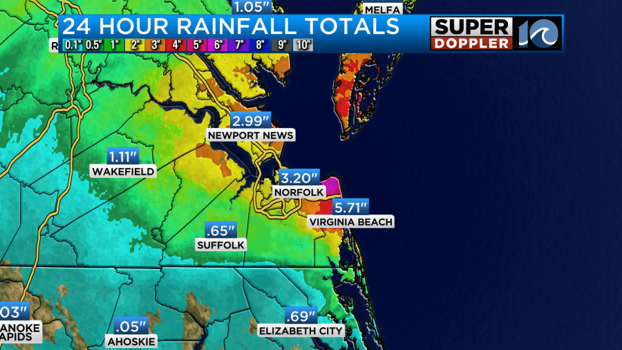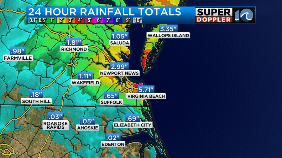 It was heavy in some other spots as well like the lower Eastern Shore, Norfolk and Portsmouth. There was some flooding in some of those locations as well. Here are the 24 rainfall totals.