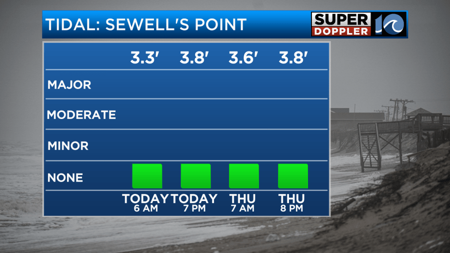 The good news is that these will be mostly light and scattered. There will also be some drizzle at times on-and-off through the day. Winds will be much lighter. They will run out of the southwest/south at 5-15mph. This will keep the tides down today. They will be below even nuisance tidal flooding levels.