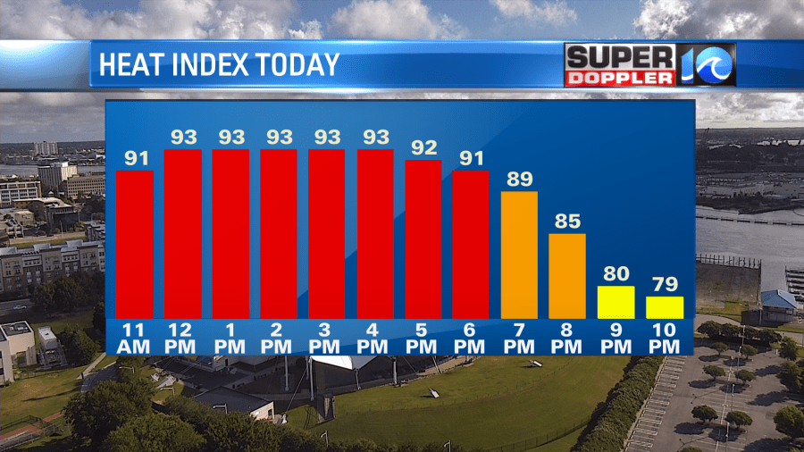 We’ll be hot and humid today. High temps will be in the upper 80s to near 90 degrees. However, the heat index will be in the low-mid 90s.