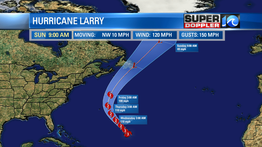 Here is an update on the tropics … Hurricane Larry is still a major hurricane. It has kept its sustained winds of 120 mph since yesterday. It is also still on a northwest track