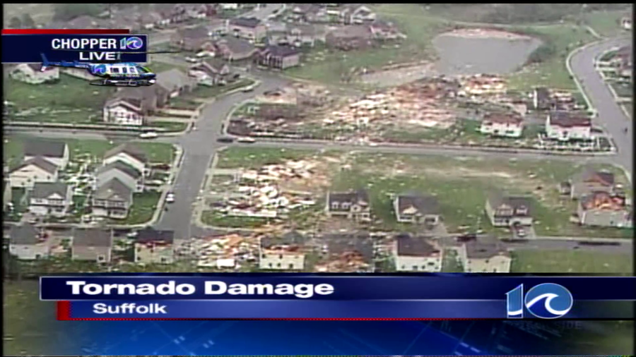 At 3:50 p.m., a tornado warning was issued saying “doppler radar indicated a severe thunderstorm capable of producing a tornado near Holland, moving northeast…” The National Weather Service would issue a total of 17 tornado warnings that day – but none were for a tornado as strong as the one that hit Suffolk.