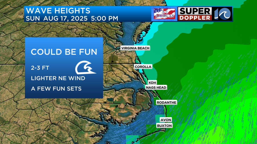 Alright, now lets talk surfing! This weekend will not feature anything impressive as Erin will still be far to the southeast near Puerto Rico at the time. Waves will be small for the most part in the 2 foot range with onshore winds providing a bit of texture to the face of the waves. If you are looking for a time to target this weekend, try Sunday as long period swell from Erin may slowly creep in. Surf should be in the 2-3 foot range especially in the outer banks and while the wind will be onshore it should be lighter during the day.