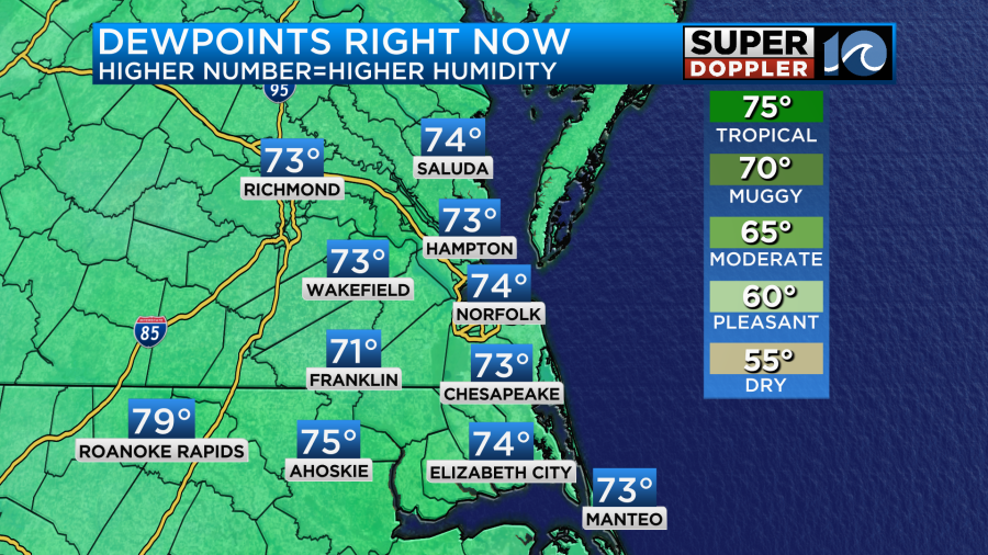 That will really help out in how it feels outside. Also, the humidity is down (slightly). Dew points are more in the low 70s today.