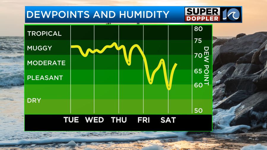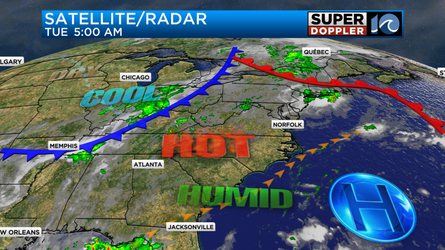 It was very hot and humid again, and it was just another tough day to be outside with the heat index up to 105. Today there are some slight improvements to the weather. We have high pressure offshore with a cool front far to the west.