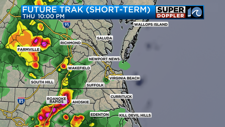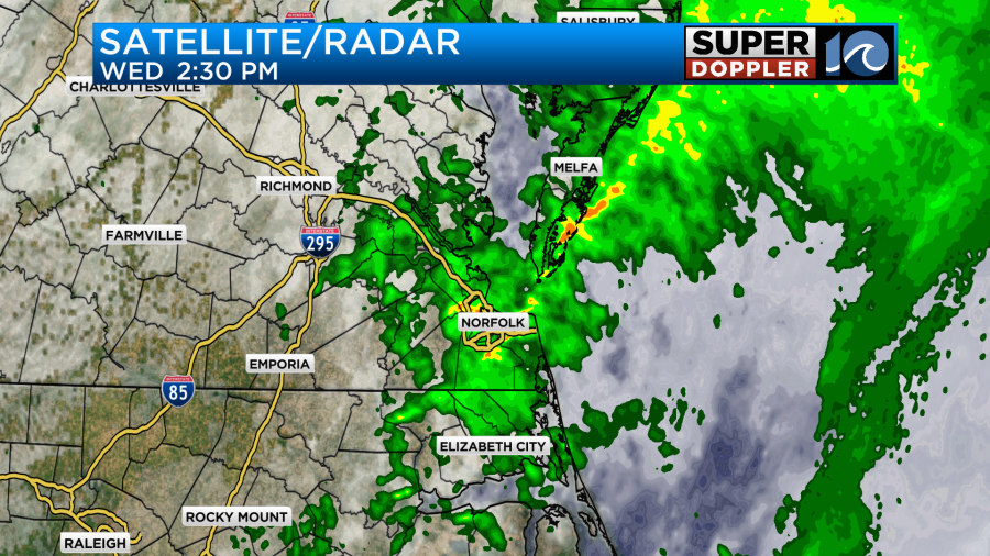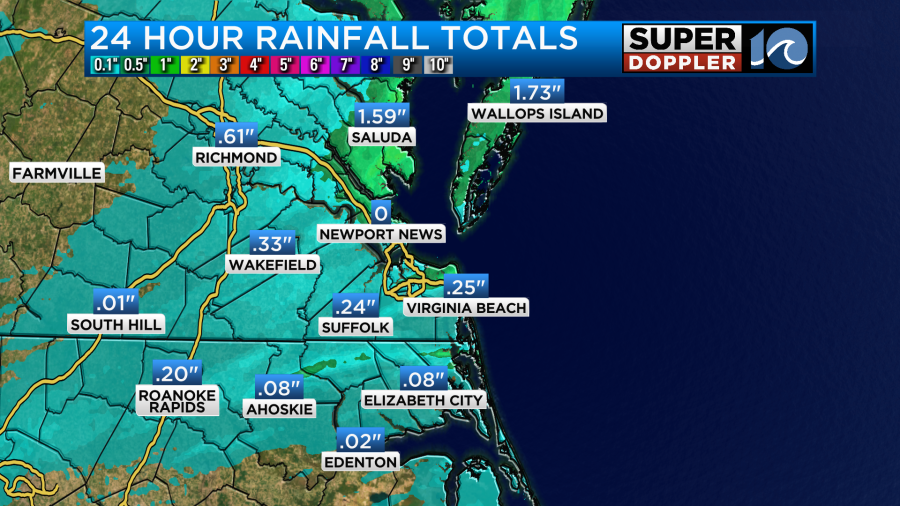 For some reason the sensor in Newport News stopped recording, but Fort Eustis had about 6 tenths of an inch. The green area is where there was about 1-2 inches of rainfall. There was a strip of that higher amount north of Interstate 264 in Virginia Beach. Norfolk recorded about three quarters of an inch.