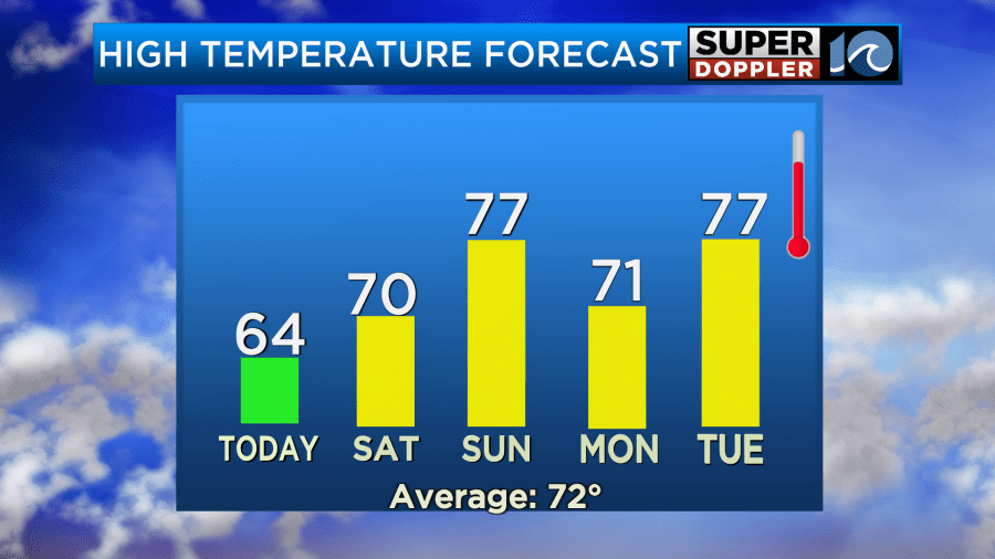 Tomorrow we’ll have similar weather, but there will be some slight differences. We’ll be partly sunny instead of sunny. Also, winds will be light and variable. That will let the temps warm up to around 70 degrees.