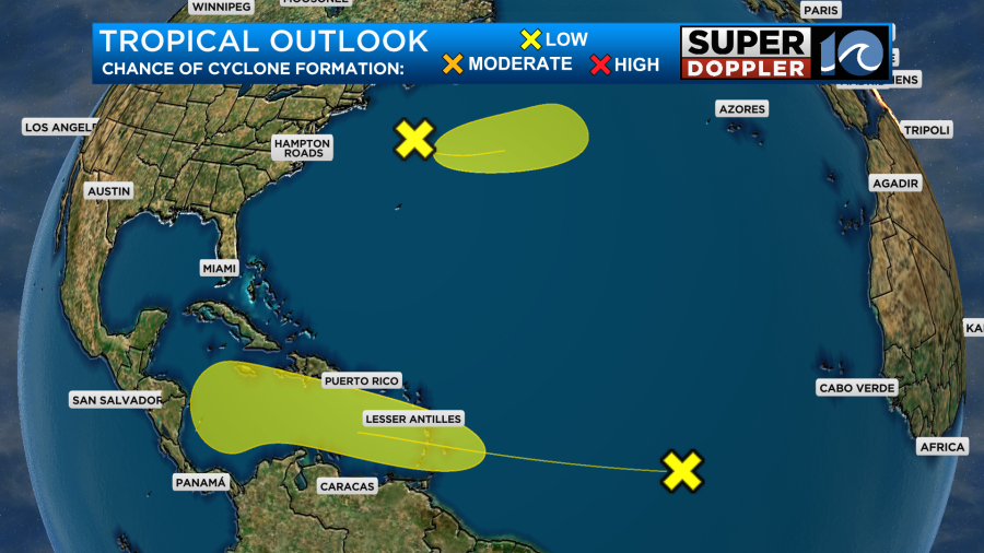 There are two weak disturbances in the Atlantic that have a low chance of formation.