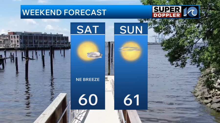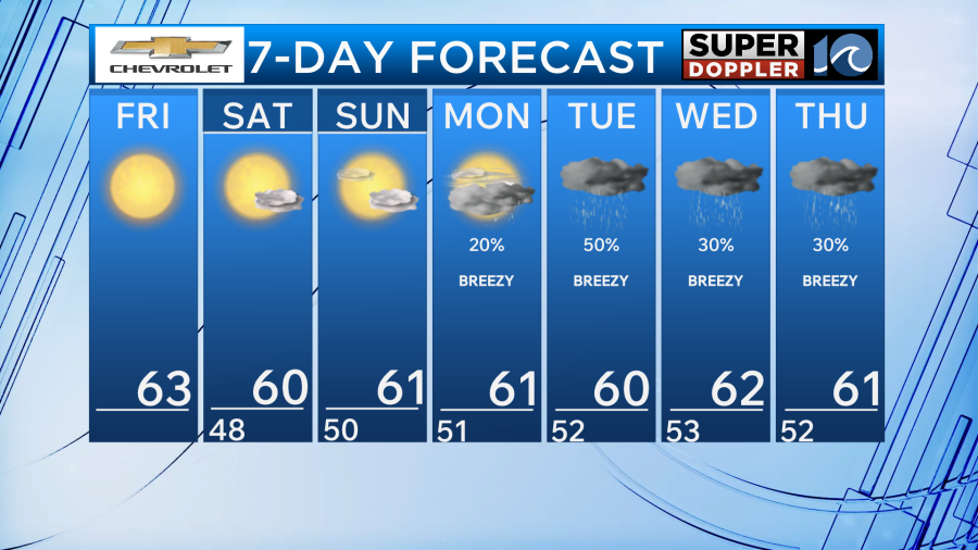 Saturday will be in the upper 50s to lower 60s under mostly sunny skies. Winds will be a bit breezy for the coastline. On Sunday, we remain cool but a few clouds in the upper levels may filter out the sunshine a little bit. These clouds are ahead of our next storm system.
