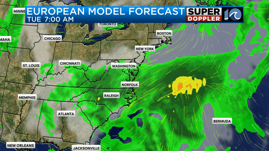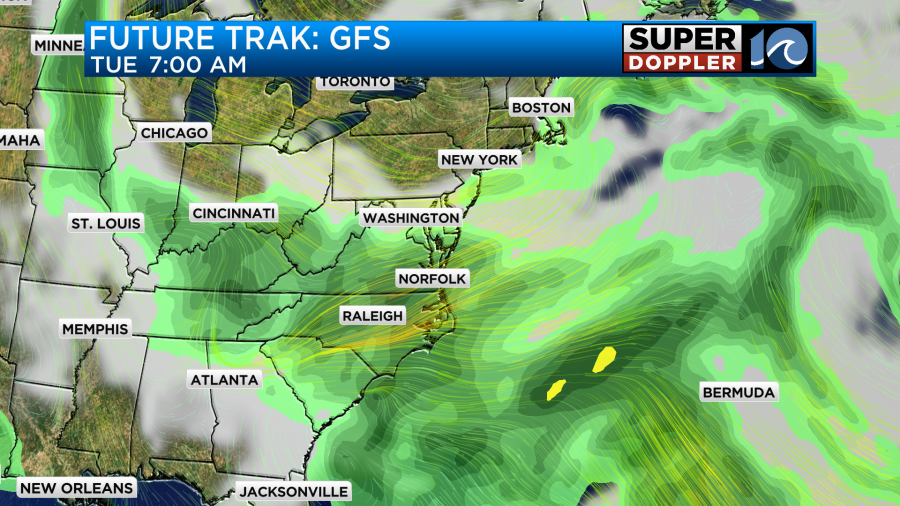 Rain chances increases later in the day on Monday as an area of low pressure moves in from the southwest. As the system approaches it may get a little boost in energy from the Atlantic. Rainfall could be heavy during the day Tuesday and Wednesday with gusty winds at times. Gusts may be as high as 30mph through the middle of next week. Thursday and Friday the storm will pull north and allow for our area to dry out.