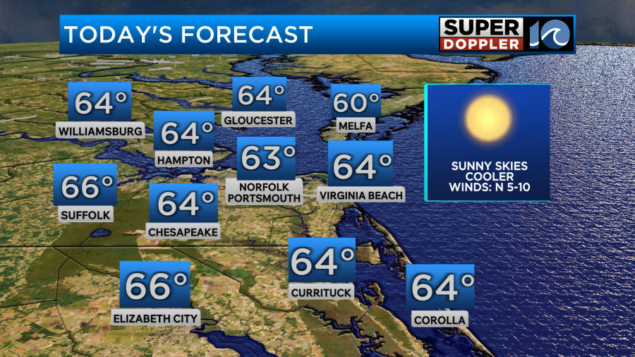 High temperatures today will be in the lower 60s for most of the area with light winds out of the north.