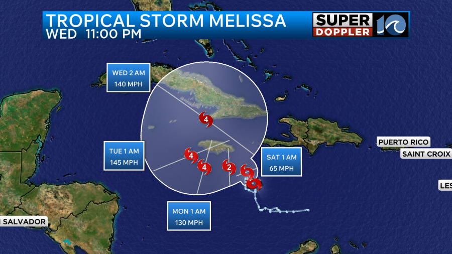 In the tropics there are no major updates with Tropical Storm Melissa. It is still a slow moving and weak system. This weekend the environment will likely become more suitable for development and the National Hurricane Center is expecting Marissa to rapidly develop into a category 4 by Monday and Tuesday.