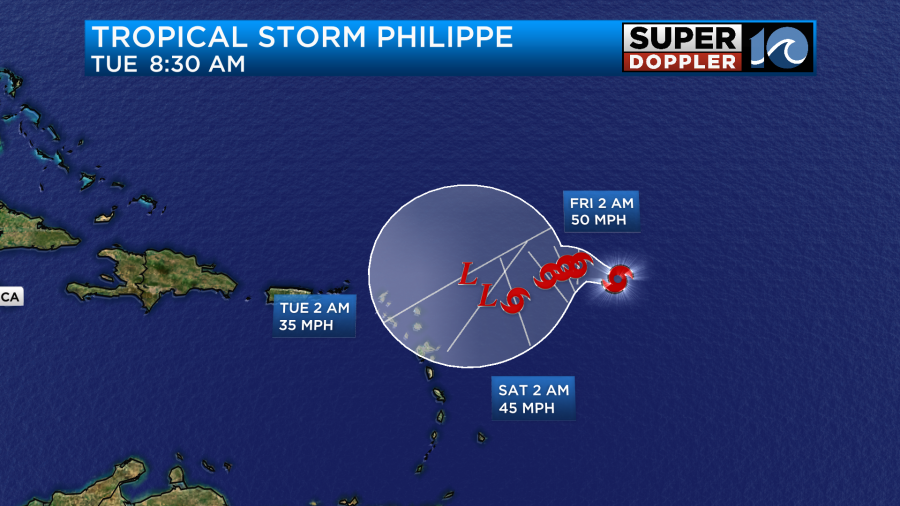 Tropical storm Philippe is having a dramatic life, but not a powerful one. It is currently weak and moving to the west.