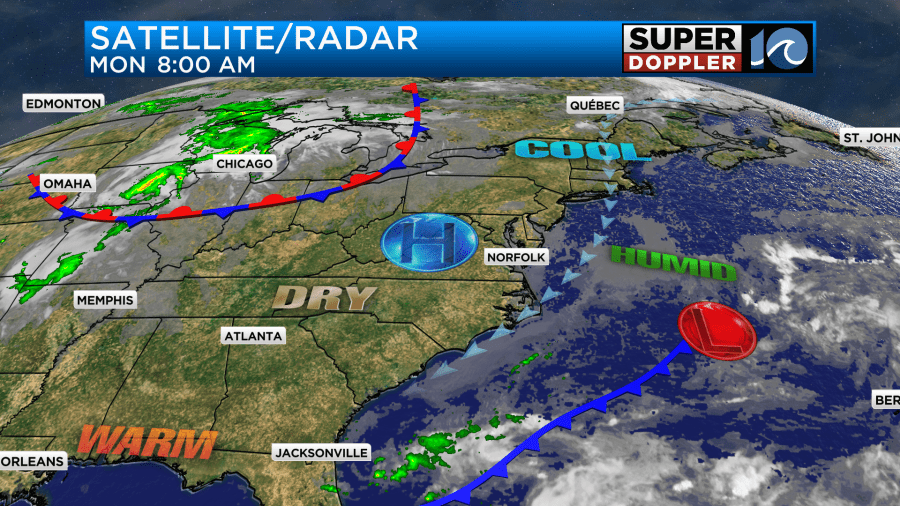 By Wednesday the low pressure area offshore should be pretty far away. Also high pressure should build in overhead. So we are looking mostly sunny and warmer. High temps will quickly rise to the mid 80s.