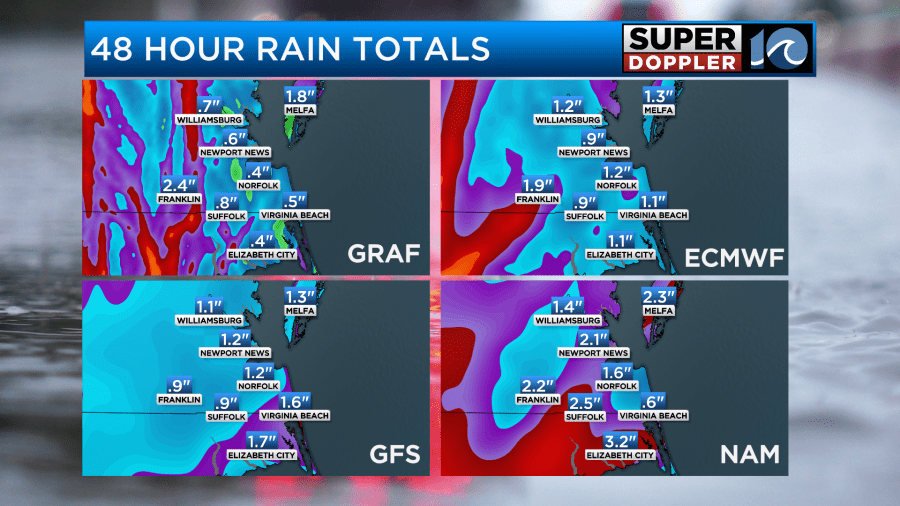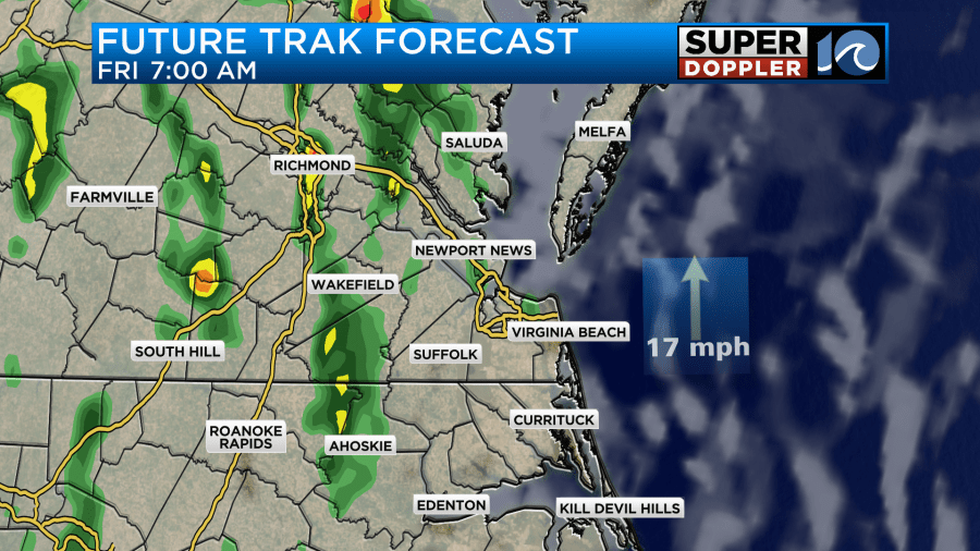 (WAVY) — Heavy rain has been falling in several rain bands that have stretched out far from the center of Debby over the past 48 hours as tornado watches continue through large stretches of northeastern North Carolina and Hampton Roads until 7 a.m. Friday.