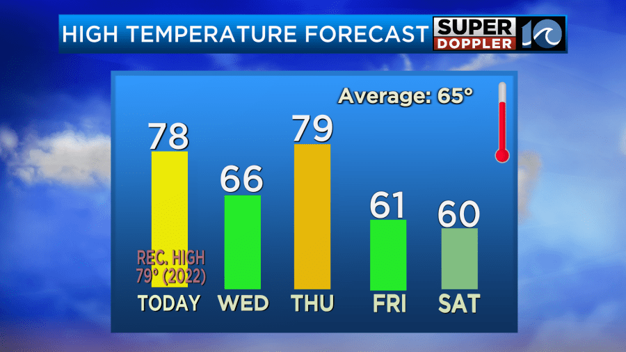 We’ll be mostly sunny, but the northeast breeze will keep the temps down. There may be some 70s inland/south. The front will bounce back north as a warm front on Thursday. So high temps will jump to the upper 70s again. We might even make it to 80.