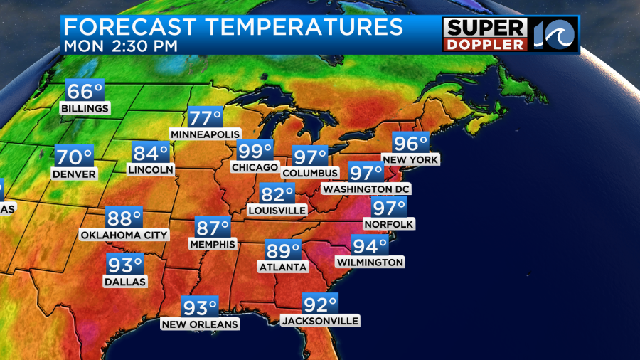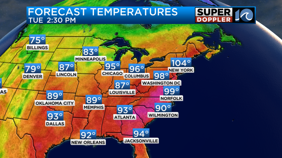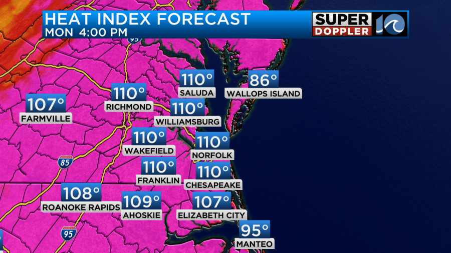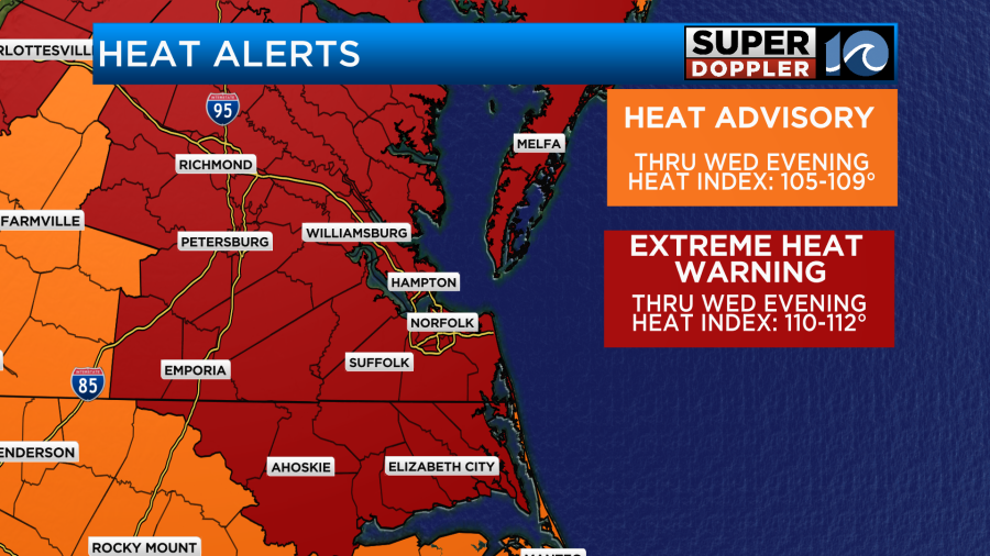 Look at the New York area. They could potentially reach up to 105 degrees. We will likely be in the upper 90s here, but we may hit 100 in a couple of inland locations like Williamsburg, Chesapeake, and/or Ahoskie. The heat index will be over 105 for many. So more heat alerts are likely as well.