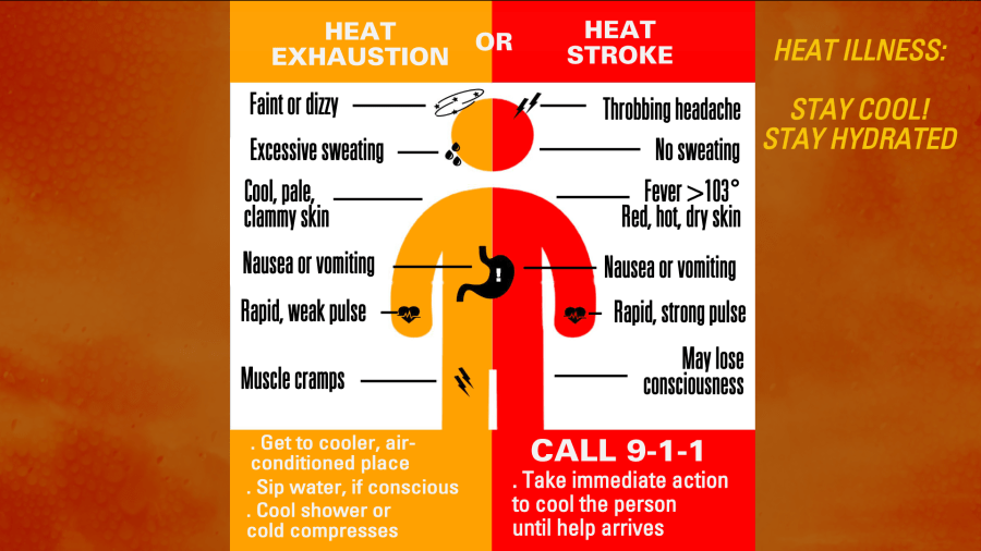 I think the most important distinction between the 2 is that you may stop sweating if you have heat stroke. Also, your body temperature can rise above 103 degrees. In that case call 911. If you have heat exhaustion, then go indoors, cool down, and put cool water over your hands, wrists, face, and neck. So try and avoid these things. Be sure to stay hydrated throughout the day. Take lots of breaks in the shade or indoors if you are working outside. Check on the elderly and the young. Bring the pets indoors if you can. If you can’t, then make sure they have shade all day and access to cool water.