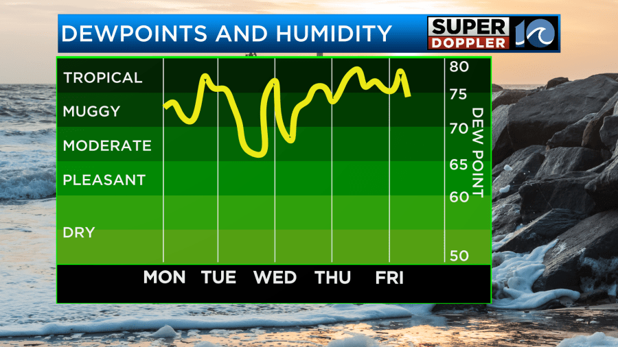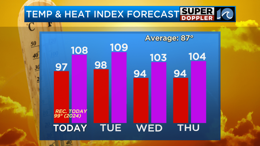 We’ll stay in the 90s all week. The heat index will probably stay over 100 as well. Dew points may dip briefly for a time or two, but overall they will stay above 70 through Friday.