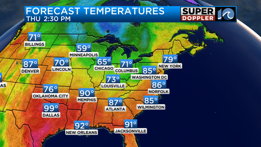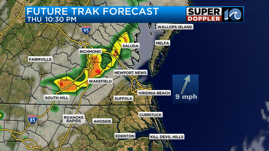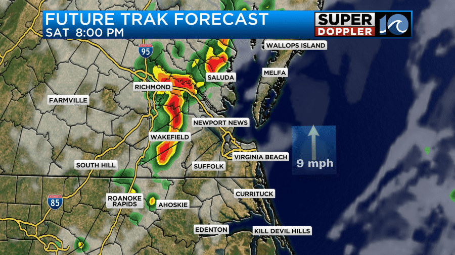 We’ll have fair skies during the day. Winds will be light and out of the south. That combo will help to boost the afternoon temperatures. I’m not expecting rain during the day aside from a stray shower. However, there will be a cluster of showers and storms pushing towards our region this evening. Some of these may make it into locations north/northwest of Hampton Roads.