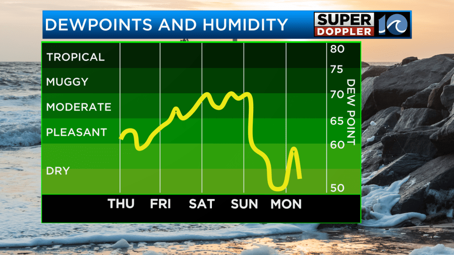 Scattered showers will continue from Saturday night into Sunday morning. After the front arrives temps will sink to the upper 70s, and the humidity will drop sharply. The rain should end by the afternoon. We’ll stay cool going into early next week with highs in the 70s.
