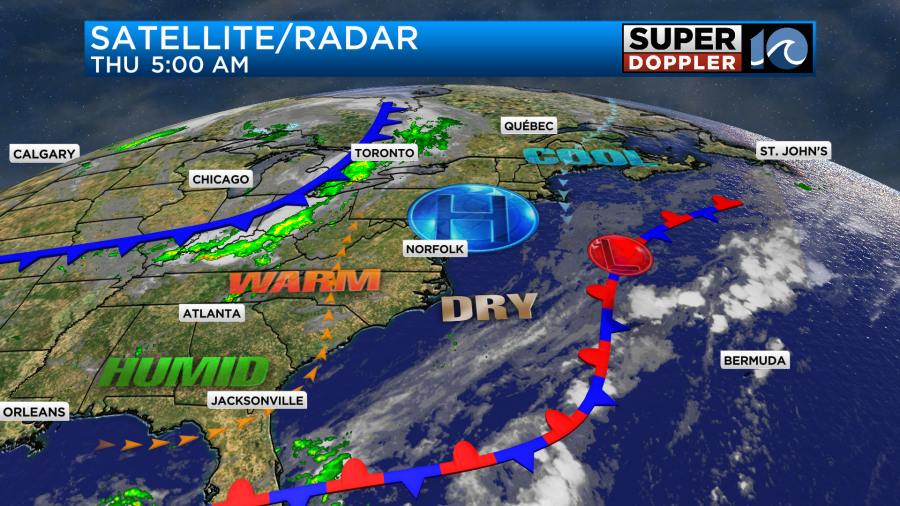We have a small area of high pressure that is sliding east. There is a stationary front offshore (still), and there is a cool front over the Ohio River Valley.