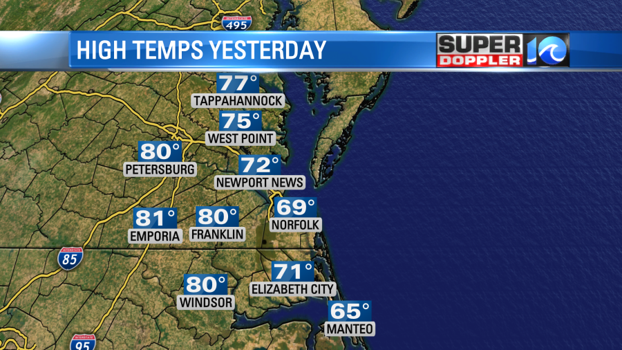 Yesterday, was a nice day, but we did end up with some mixed temperatures for highs. The northeast breeze kept Norfolk’s temperature in the upper 60s, but we hit 80 in a few inland areas.