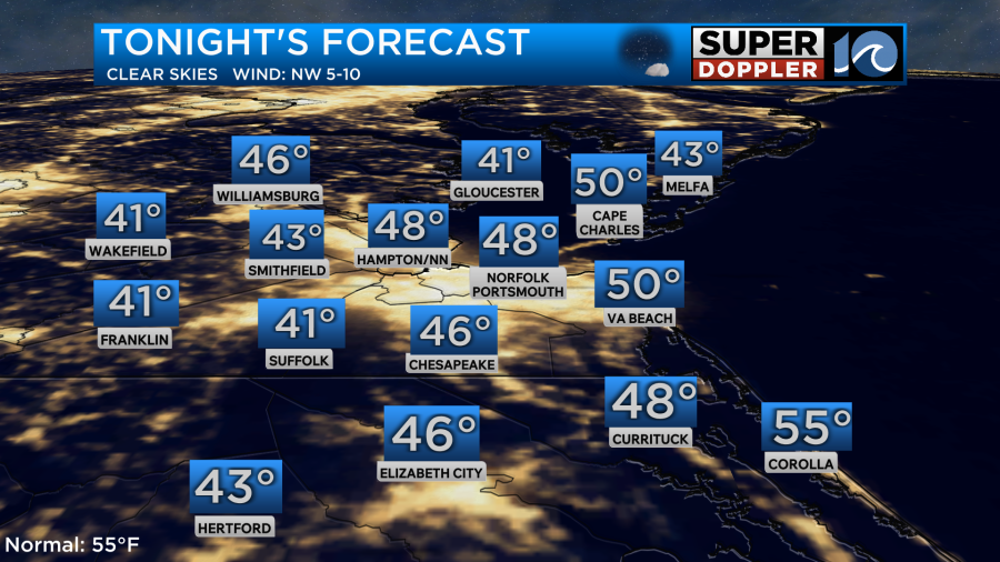 Tonight the winds will slacken quite a bit. With clear skies expected, that will allow temperatures to drop big-time. Overnight lows will be in the 40s.