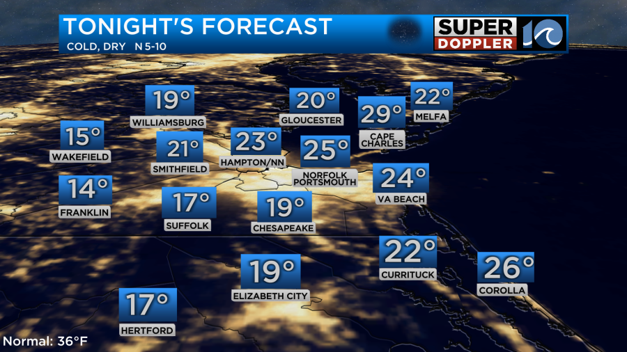 Tonight we’ll be cold again. Skies will be clear, and winds will lighten up. This will let temps drop down to the teens and 20s again.