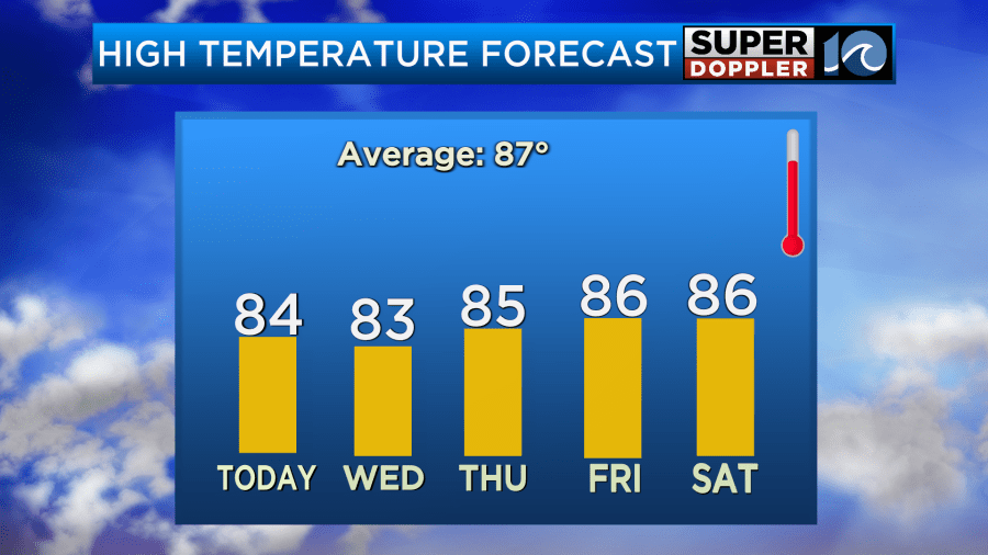 You’ll notice that there are a few rain showers just to our west. These are from an upper level disturbance that will swing through the region today. So we’ll have some isolated showers with partly cloudy skies. High temps will be in the low-mid 80s.