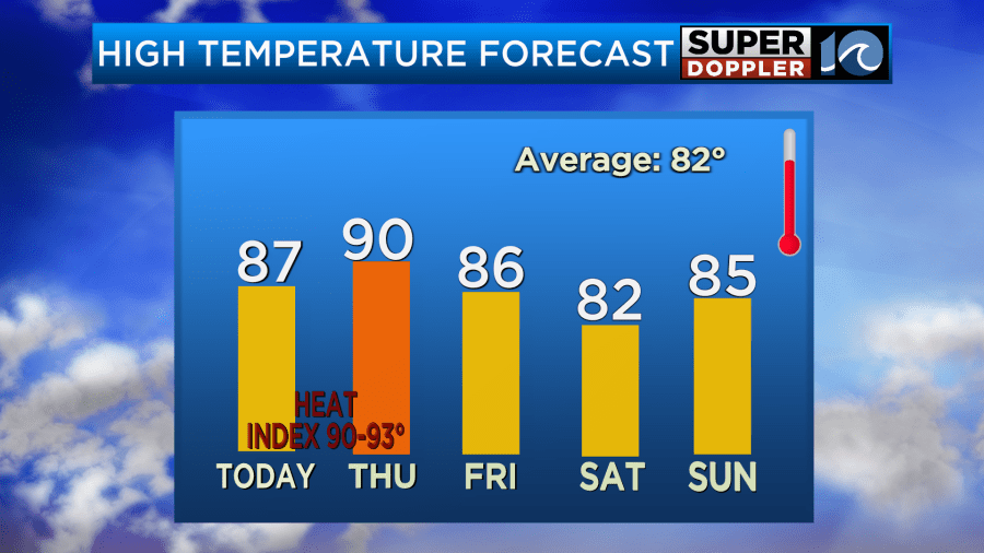 The heat index will be in the low-mid 90s Thursday. However, the stronger breeze should help a bit.