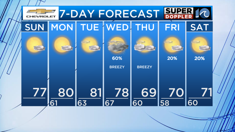Happy Sunday! High pressure remains until Tuesday, keeping us dry with sunshine. Then a cold front will bring us rain and a cool down midweek.