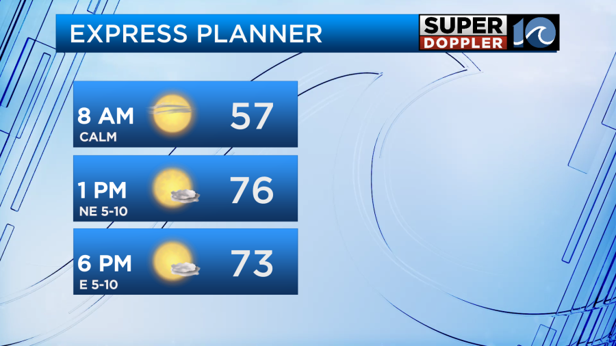 Today will be very similar to what we saw Saturday. Lots of sunshine continues with light winds. High temperatures will get a couple degrees warmer into the mid to upper 70s. There is still a high rip current risk at the beach with 3-4′ waves.