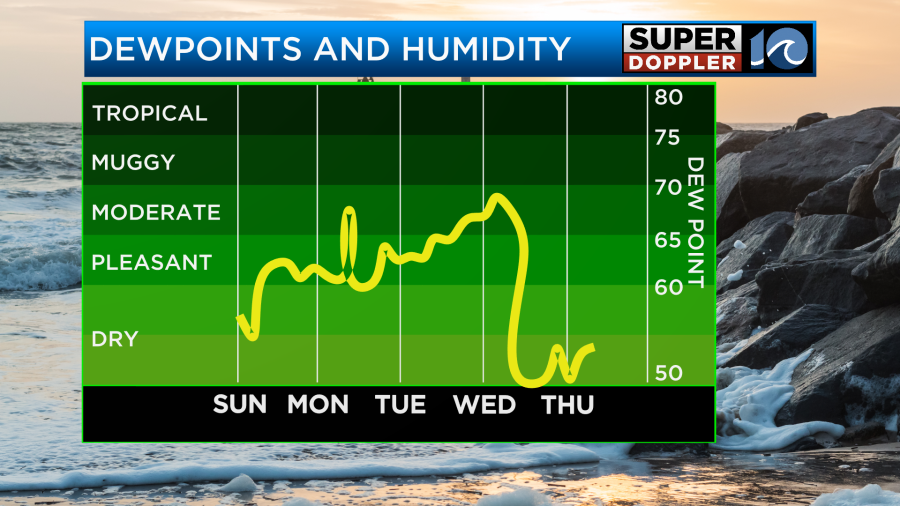 Monday and Tuesday will be a little warmer and a little more humid. Highs in the low 80s with dew points in the mid 60s. Still dry with plenty of sun both days. Increasing clouds later Tuesday ahead of the approaching cold front.