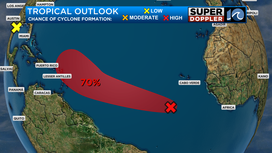 In the Atlantic, the wave that originated off the coast of Africa now has a a 40% chance of formation in the next 2 days and 70% chance in the next 5 days. The next name on the list is Jerry. We will continue to watch this development and keep you updated.