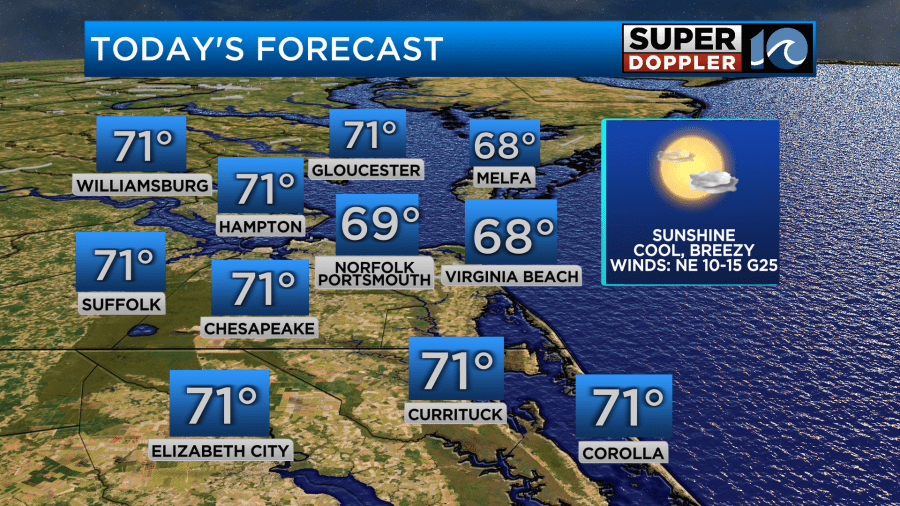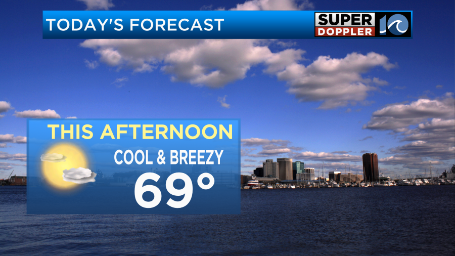 With this dome of high pressure we will have partly cloudy to mostly sunny skies today. Despite this increase in sun, northeast winds will keep highs below normal by about 5-10 degrees. Coastal areas will be in the upper 60s while inland communities reach around 70 degrees.
