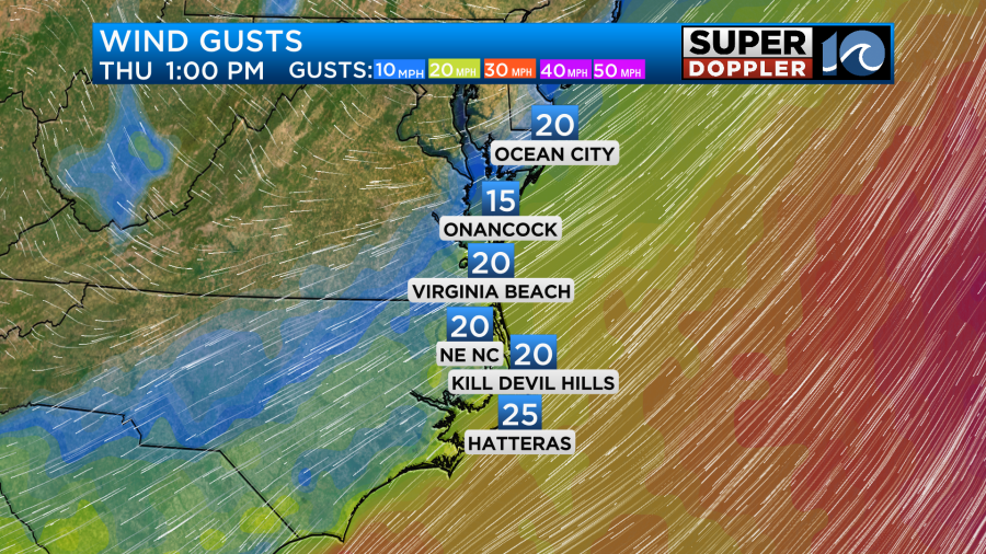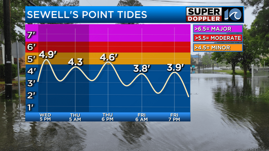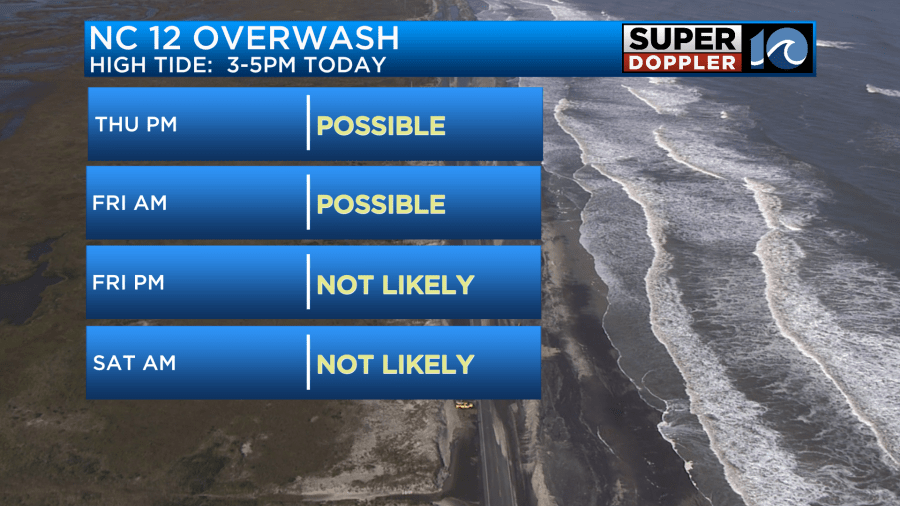 This onshore wind will remain through the day tomorrow. As a result, coastal flooding will be a concern again for the southside this afternoon during high tide. Some minor coastal flooding is expected but some more vulnerable areas may get close to moderate coastal flooding. Along NC 12, overwash will remain possible today and into tomorrow morning before the ocean begins to relax heading into the weekend as winds calm down.