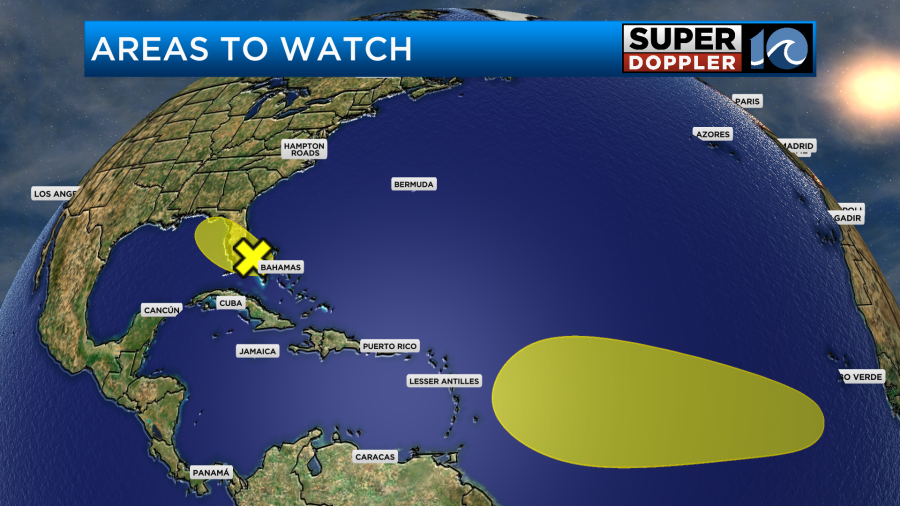 In the tropics we have a couple areas that we are watching for development. Both have low chances for development but over the coming days, stay tuned for changes as the timing is still a long ways out from any development.