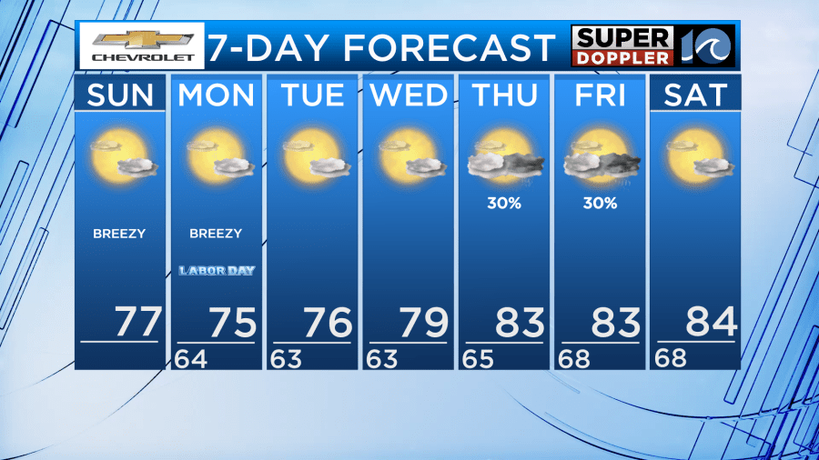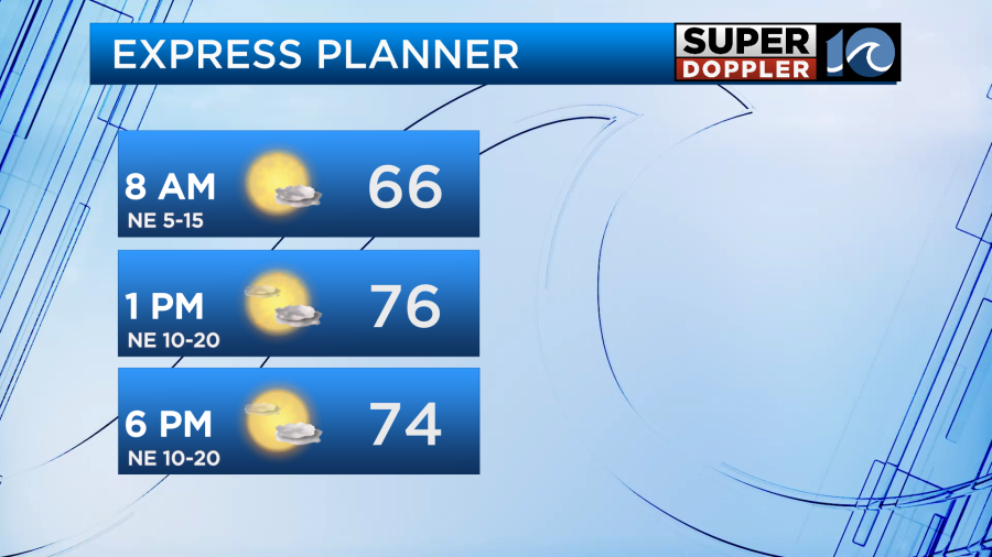 If you enjoyed yesterday’s weather, you’ll love the weather we have in store for today and tomorrow. Very similar conditions with high temperatures in the mid to upper 70s and passing clouds. We will be breezier with northeast winds 10-20 MPH.