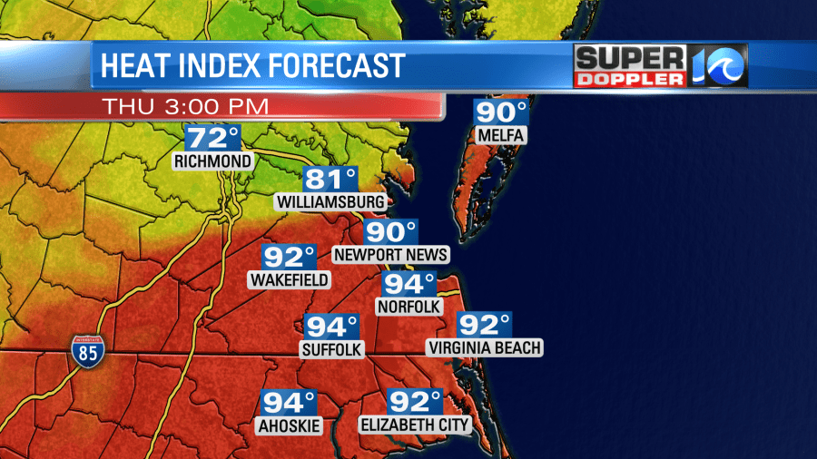 The heat index will be in the mid 90s for many. However, temps will drop for some during the mid-afternoon. Look at the difference in the heat index between Norfolk and Williamsburg.