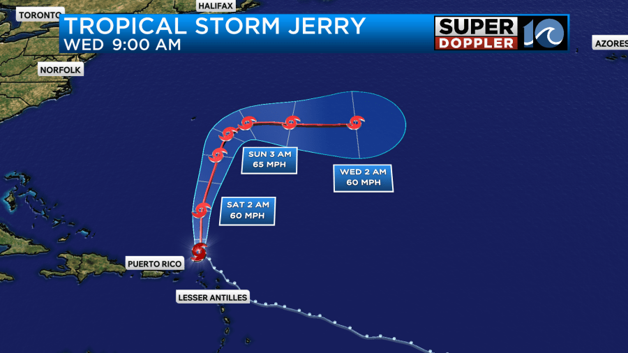 Tropical storm Jerry actually weakened since yesterday. This may have been due to some of the interaction with the Lesser Antilles, but it is more likely from some wind shear. The forecast for Jerry has it weaker now as well.