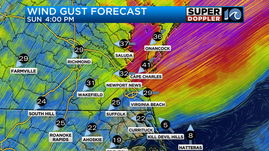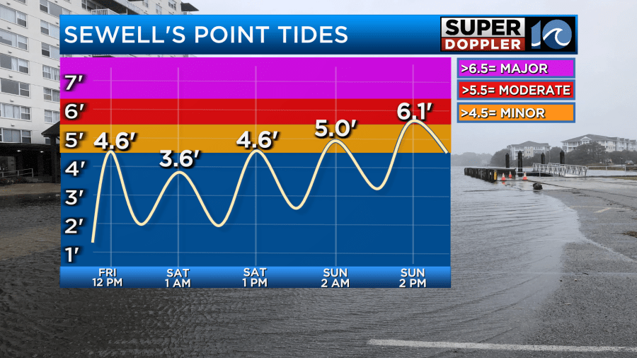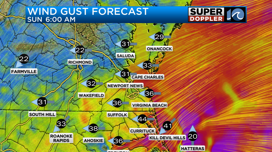 It should be low-end minor until Sunday morning. However, as the winds increase on Sunday the levels may get up into solid-moderate. That level will be about the same for Lynnhaven Inlet Sunday afternoon, but that level is considered “Major” at that location. There could be some other spots of major, but we’ll have to check back for the updates on that. Especially since the models have brought the winds down slightly already. There will likely be some more ocean overwash. Here is my forecast for that.