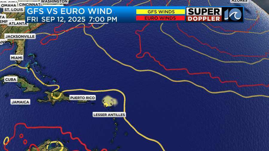 It will continue to track west this weekend, and it will probably become a tropical depression or tropical storm. However, the models are not as set as to what it’s gonna do. The GFS keep bouncing around all over the place after day 5. It still has it heading towards the Lesser Antilles in several days. However, the European model now basically kills-it-off. Here are the two models in about 7 days.