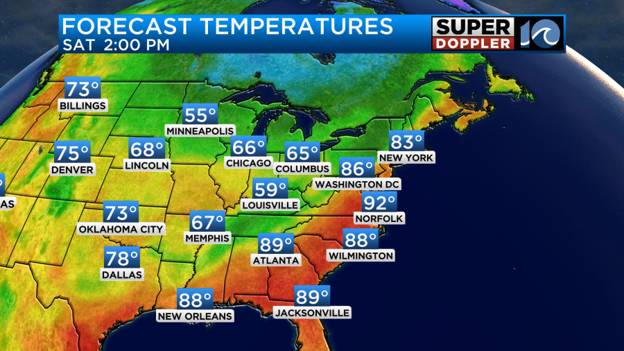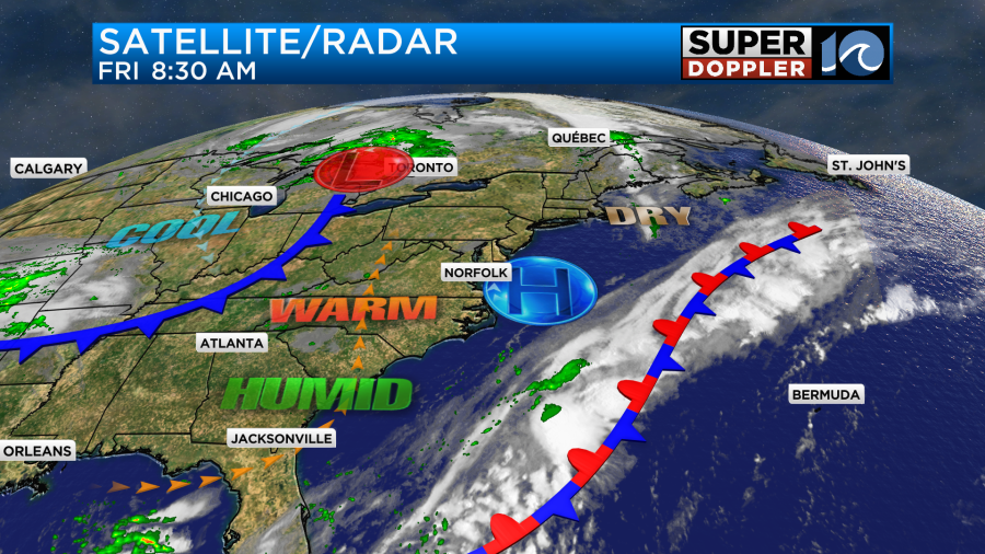 We’ll be mostly to partly sunny with a light southwest wind. High pressure is just offshore with a stationary front farther to the southeast. The cool front is still slowly drifting over the Midwest.