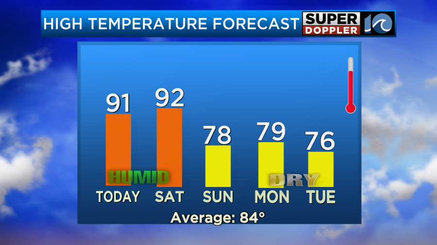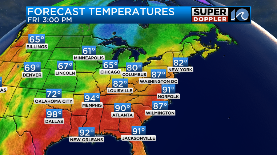 Tomorrow the cool front will move closer to the area, but it won’t move through yet. So we’ll have another hot and humid day. High temps will run up into the low 90s again.