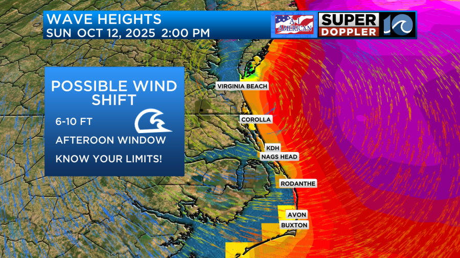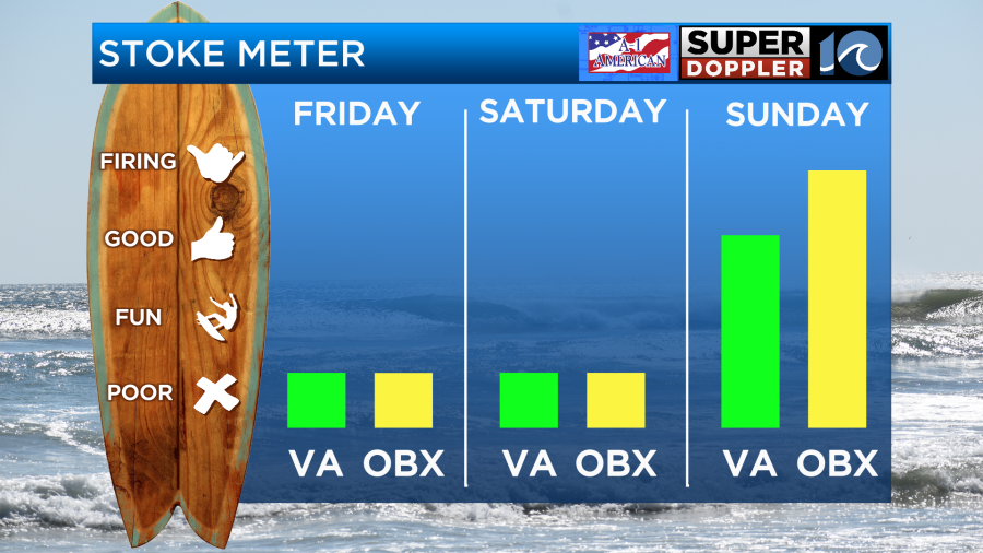 Sunday, the coastal low will be bringing the worst of the weather to our region. During the morning, surf will be massive and blown out with tropical storm force onshore winds. During the afternoon the storm will continue heading north and that is where a window of ridable surf opens up. It will be worth keeping an eye on surf cams across the Outer Banks early Sunday afternoon as winds start to turn offshore. This will help clean up the ocean throughout the rest of the day but make sure you know your limits. Surf will likely be in the 6-10 foot range, meaning the only surfers in the water should be those who are highly experienced. Winds across Virginia Beach will start to turn offshore during the late afternoon hours, allowing for a possible window of opportunity before dark, but this is HIGHLY dependent on the storms timing and strength, so stay up to date with the forecast as we get more information.
