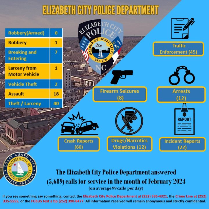These are all ongoing investigations. If you have any information, please contact the ECPD at 252-335-4321, the Crime Line at 252-335-555 or the FUSUS text a tip at 252-390-8477.