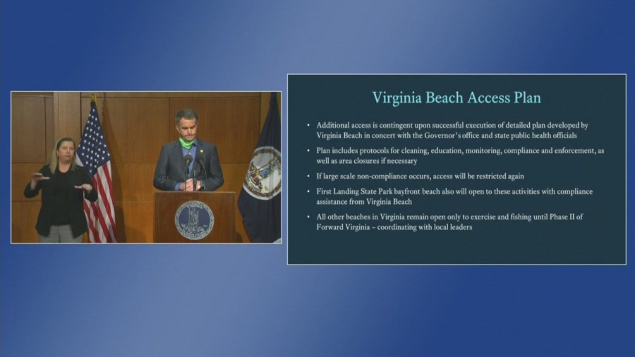 RICHMOND, Va. (WAVY) — During his Monday afternoon coronavirus briefing, Gov. Ralph Northam announced that he would be reopening public beaches in Virginia Beach starting this Friday, but that there would be restrictions.